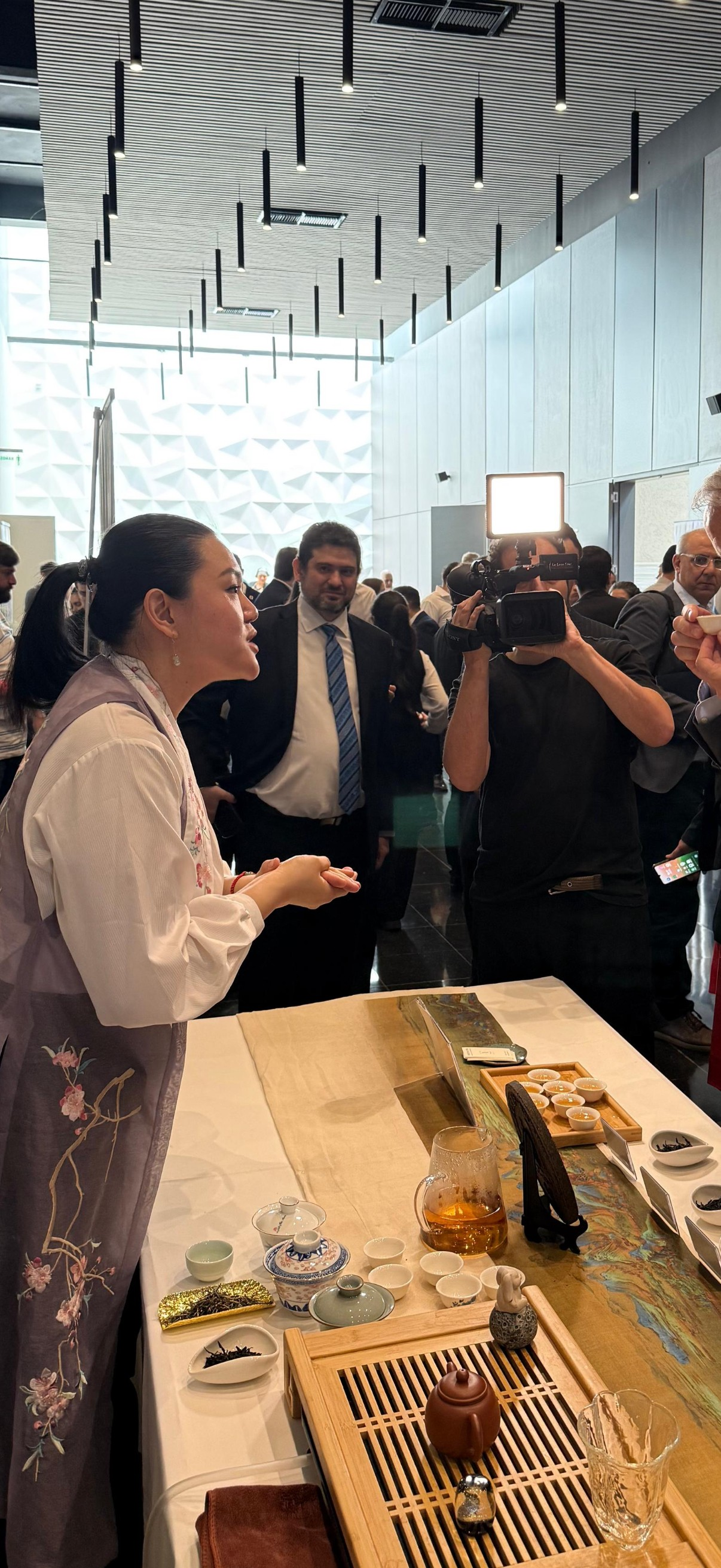 Un espacio elegante y en movimiento dentro del evento: té servido en vivo, cristalería, aromas que acompañan, gestos pequeños que elevan la experiencia general.